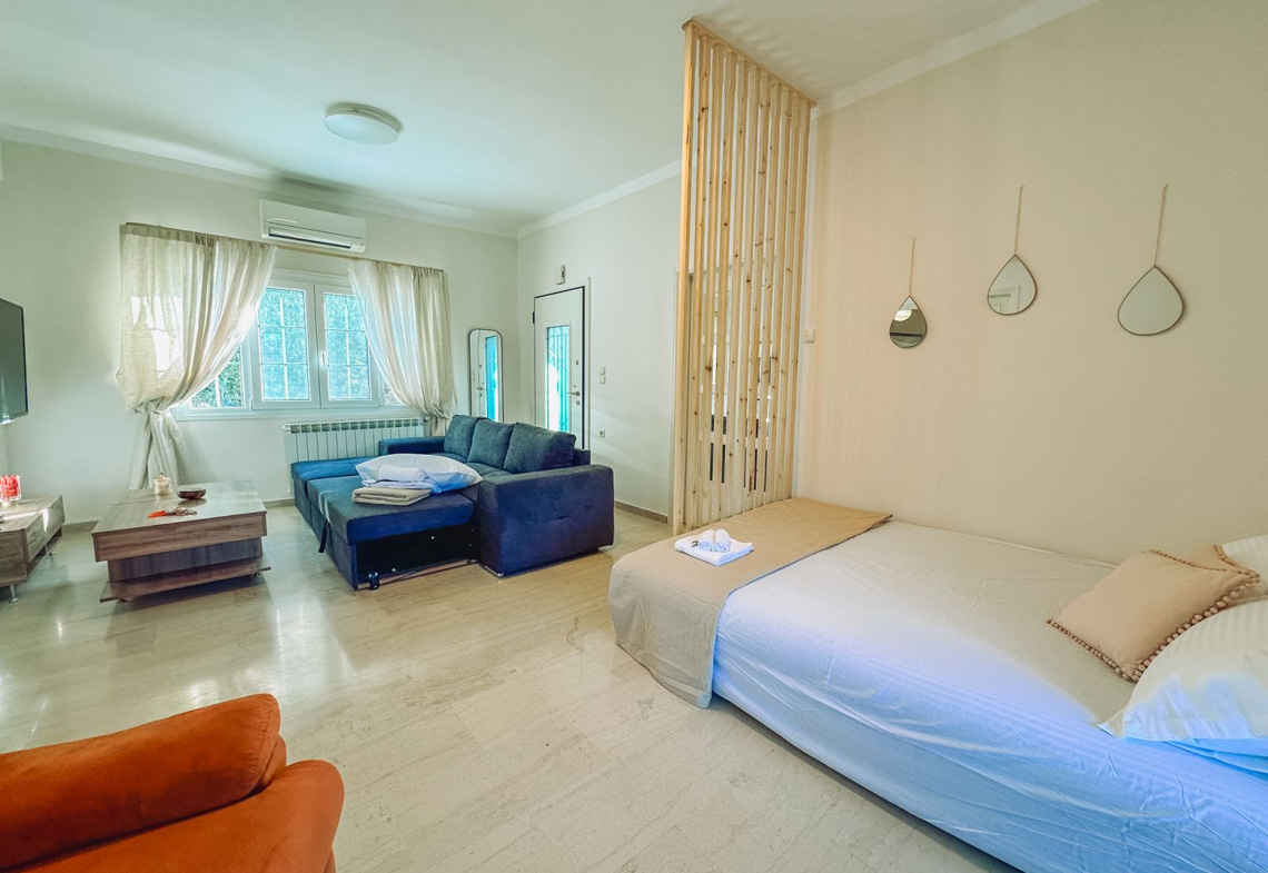 The location is ideal, as it is only 400 meters away from Gourna beach — one of the most beautiful beaches of the island — where you will be enchanted by the colors of the sunset and the endless blue. It combines tranquility and luxury near the sea and the mountain and at the same time the location is very helpful since everything is at short distances.