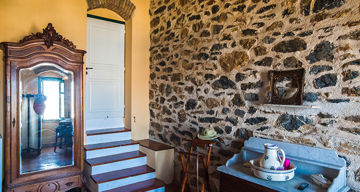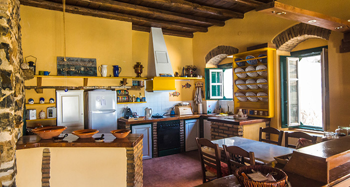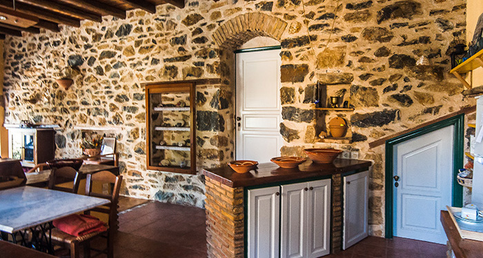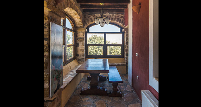 It is entirely built in the traditional way, in stone, with wooden ceilings and wooden floors. It covers an area of 200 m² on a plot of 2.200 m². It consists of a spacious entrance with a big glazed-in sitting area, a living area in two levels (a living room with a dining area in the first level and a kitchen in the higher level), a master bedroom with a walk-in closet and an on suite bathroom, and of four more bedrooms and two bathrooms. The property has also three verandas with stunning views to the sea and a breathtaking sunset.